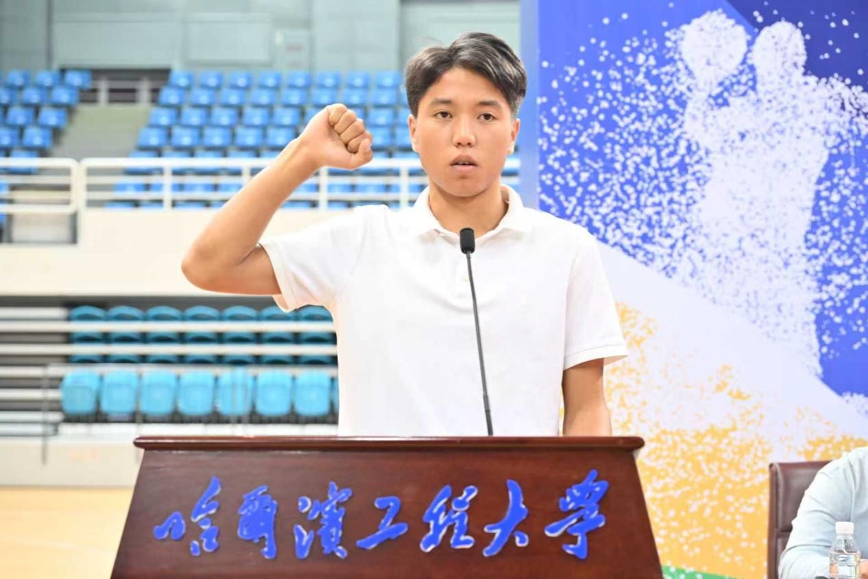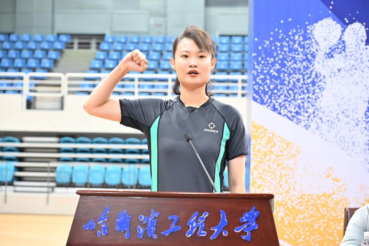WANG Zirou, a teacher from the Department of Physical Education, took the oath on behalf of the referees, while Yernal Hasenali, captain of the 2025 Freshmen Basketball Team from the College of Shipbuilding Engineering, took the oath on behalf of the athletes.
