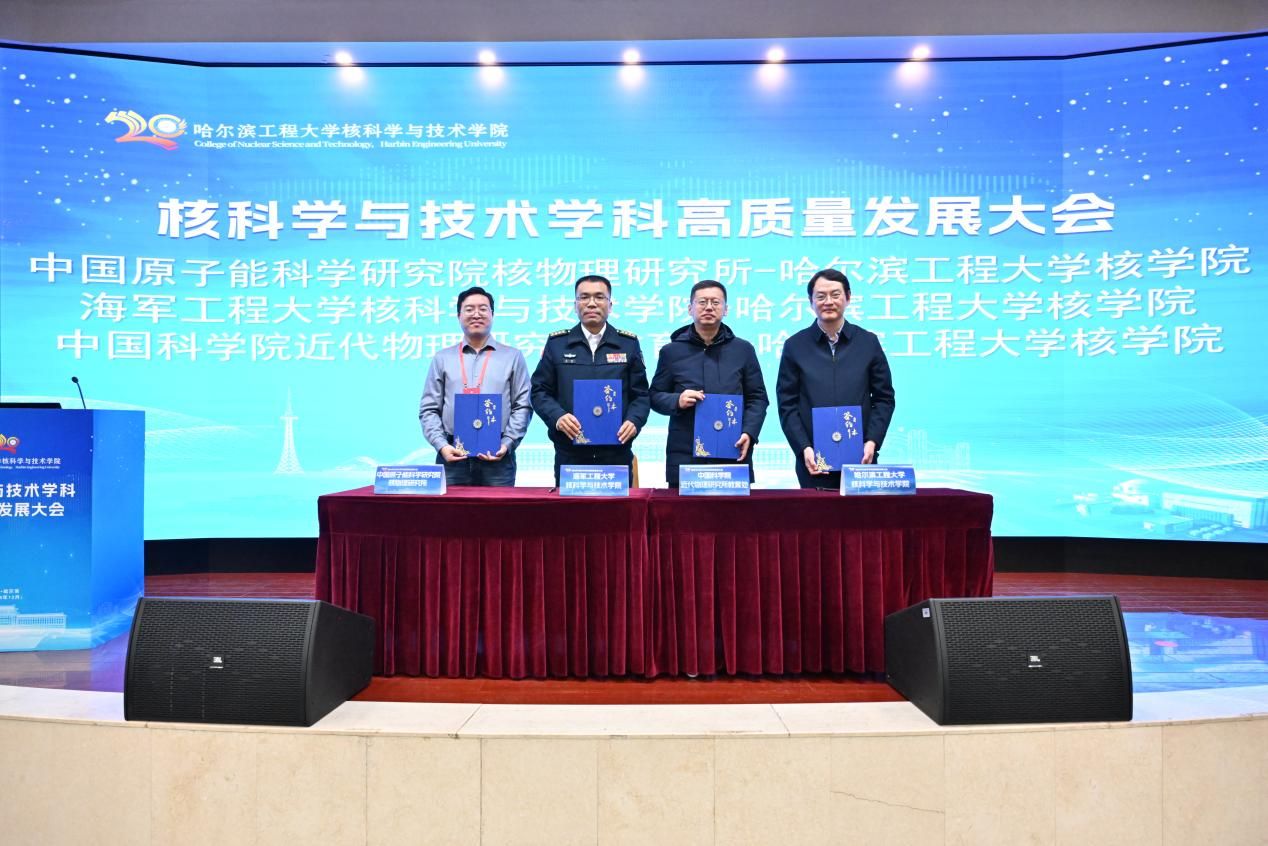 Relevant persons in charge of the College of Nuclear Science and Technology signed agreements with JIAO Xuesheng, the Party Secretary of the Institute of Nuclear Physics, China Institute of Atomic Energy, ZHAN Feng, Dean of the College of Nuclear Science and Technology, Naval University of Engineering, and HOU Suqing, Director of the Education Department, Institute of Modern Physics, Chinese Academy of Sciences respectively.
