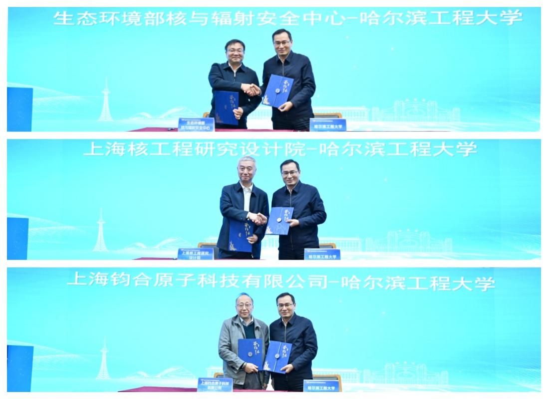 YU Zhiwen signed strategic cooperation framework agreements with FENG Youcai, Nuclear and Radiation Safety Center, HU Dengxin, Chairman of the Trade Union of Shanghai Nuclear Engineering Research and Design Institute Co., Ltd., and HE Guowei, Chief Engineer of Shanghai Junhe Atomic Technology Co., Ltd. respectively.