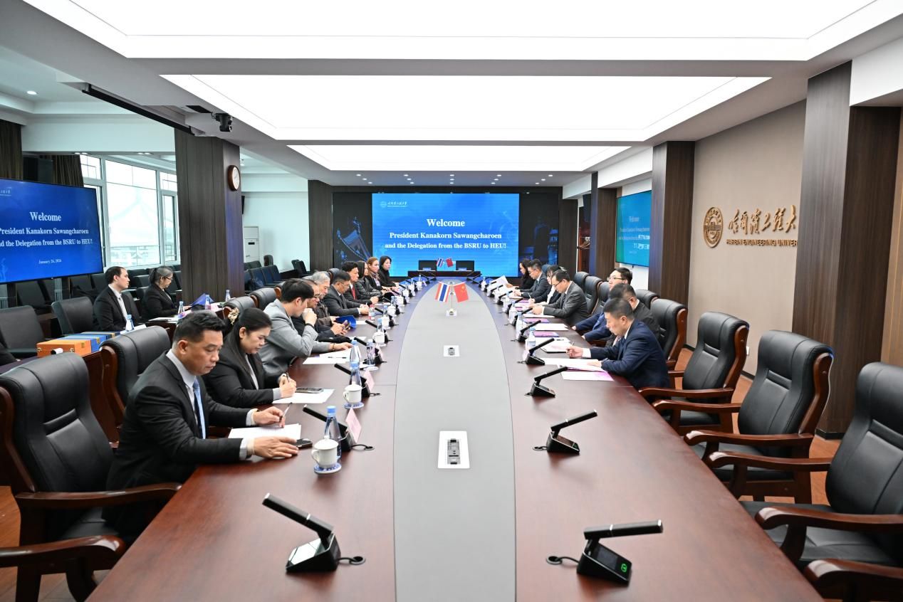 On January 26, a 14-member delegation from Bansomdejchaopraya Rajabhat University in Thailand, led by President Khanakorn Sawangcharoen, visited Harbin Engineering University (HEU). Vice Presidents YU Zhiwen and YIN Hang met with the guests.