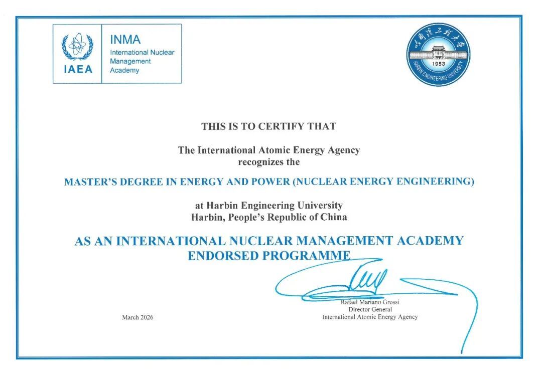In 2015, the IAEA launched the INMA certification initiative for Master’s educational programs in Nuclear Technology Management targeting universities globally, aiming to cultivate and enhance the comprehensive capabilities of managers in the nuclear sector to serve the peaceful utilization and secure development of global nuclear energy. Universities that pass the certification possess the capability for Master’s-level education and cultivation in nuclear technology management. Master’s students in the nuclear field who complete the relevant courses and cultivation requirements can receive corresponding certificates upon qualification. Since 2015, over ten world-renowned universities, including the University of Manchester in the United Kingdom, Texas A&M University in the United States, the Moscow Engineering Physics Institute in Russia, and the University of Tokyo in Japan, have successively obtained this program certification. Under the guidance of the China Atomic Energy Authority, Harbin Engineering University initiated the program’s construction and applied for certification in 2018. In 2024, the university passed the on-site inspection by international experts, making it the first higher education institution in China to obtain this international certification.